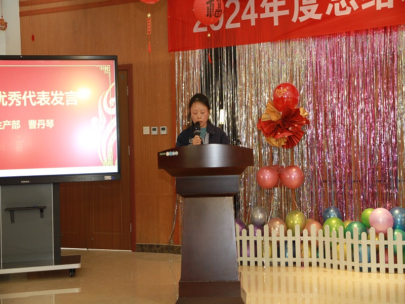 之后,生产部的曹丹琴作为优秀员工代表发表感言。她站在舞台上,略显紧张却又难掩激动之情。曹丹琴回顾了自己在生产部的点点滴滴,这是她在九江赛晶的第14个年头,从初入公司时的懵懂到如今能够独当一面,离不开公司给予的机会和同事们的热心帮助。她分享了在生产过程中遇到的困难以及如何与团队一起克服困难的经历,让大家深刻感受到生产一线工作的不易与坚守。“在九江赛晶,只要努力付出就一定会有回报。在新的一年里,我将继续努力,和大家一起为公司创造更多价值。”曹丹琴的发言朴实而真挚,赢得了台下阵阵掌声,也激励着每一位员工在新的一年里以更加饱满的热情投入到工作中。