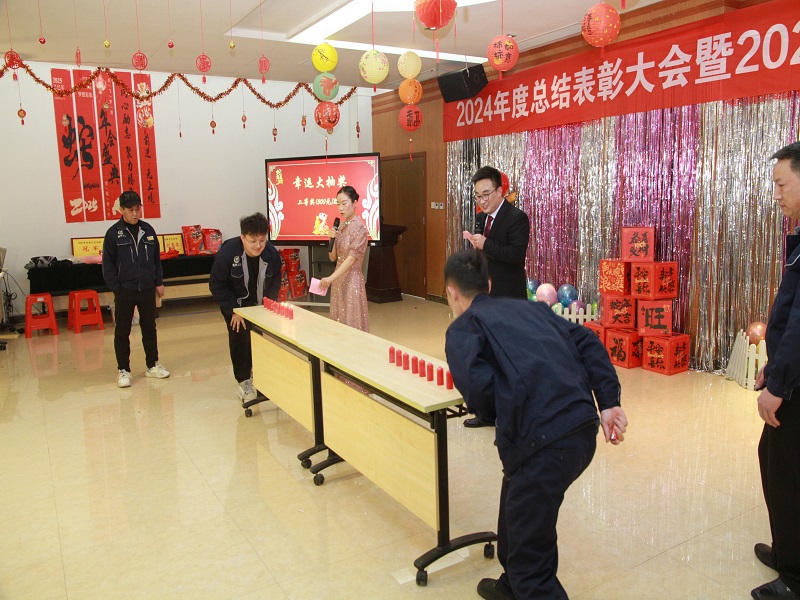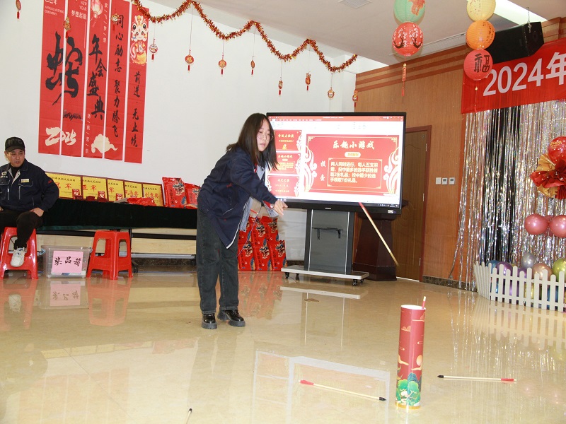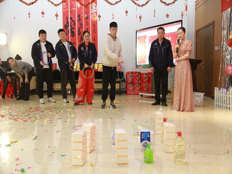 在文艺节目表演的间隙,还穿插了丰富多彩的小游戏。击鼓传花、投壶、丢乒乓球、吹蜡烛、蒙眼踏步、套圈等游戏吸引了众多员工踊跃参与。现场欢声笑语不断,进一步拉近了员工之间的距离。