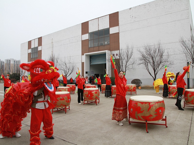 就在此时,由公司女性职工组成的美女打鼓队闪亮登场。她们身着统一的服装,精神饱满,活力四射,两只活泼的狮子在一旁随着鼓点伴舞。